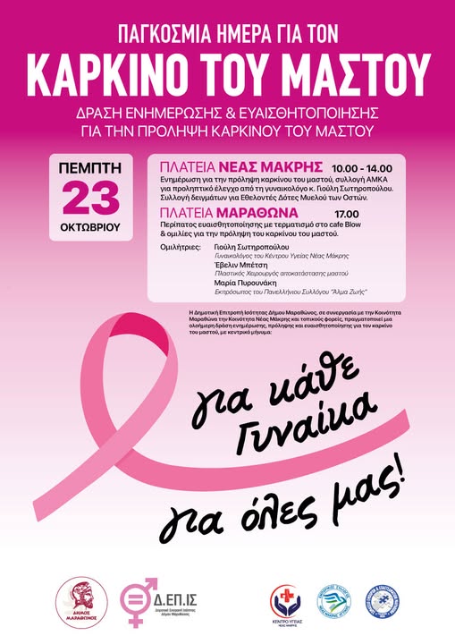 Σας προσκαλούμε σε μια δράση ενημέρωσης & ευαισθητοποίησης για τον Καρκίνο του Μαστού, στην κεντρική πλατεία της Νέας Μάκρης, με στόχο την έγκαιρη διάγνωση και την “ενδυνάμωση” όλων μας Η δράση αφορά γυναίκες κάθε ηλικίας, άνδρες που στηρίζουν τις γυναίκες της ζωής τους, οικογένειες αλλά και το ευρύ κοινό !